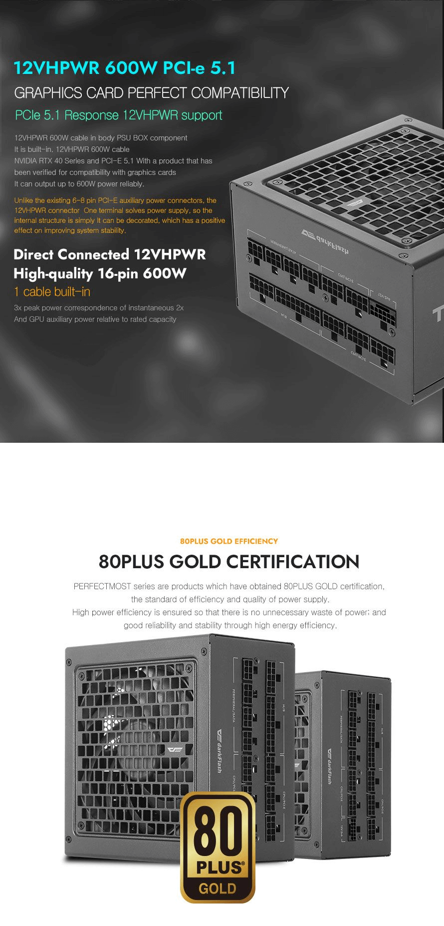 The PMT 850W power supply boasts an 80+ Gold certification, ensuring exceptional energy efficiency. This means less power wasted as heat and more energy saved, making it an eco-friendly and cost-effective option for your PC build.